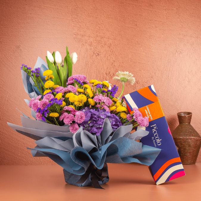 توليفة هدايا مدهشة! استمتع بتقديم هدية متكاملة تجمع بين جمال باقة زهور طبيعية زاهية ومشرقة، مع عبوة من شوكولاتة لندن بايتس اللذيذة. هذه المكعبات الشهية هي إضافة مثالية للزهور. اطلب الآن بوكس حلويات وباقة زهور لضمان إهداء لا يُنسى يعبر عن ذوقك الرفيع.