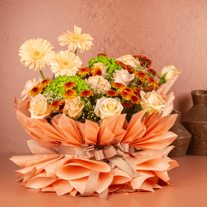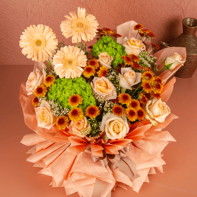 باقة مشمشي: تحفة فنية حقيقية! تنسيق فريد ومتقن من الورود الطبيعية الطازجة بألوان الخوخي (المشمشي) الدافئ والأخضر الهادئ. تم تصميم هذه الباقة ببراعة وتقديمها بخبرة عالية لإضفاء لمسة من الرقي والفخامة. اطلب الآن باقة زهور خوخية هي الخيار الأمثل لتقديم هدية راقية تعبر عن الذوق الرفيع.