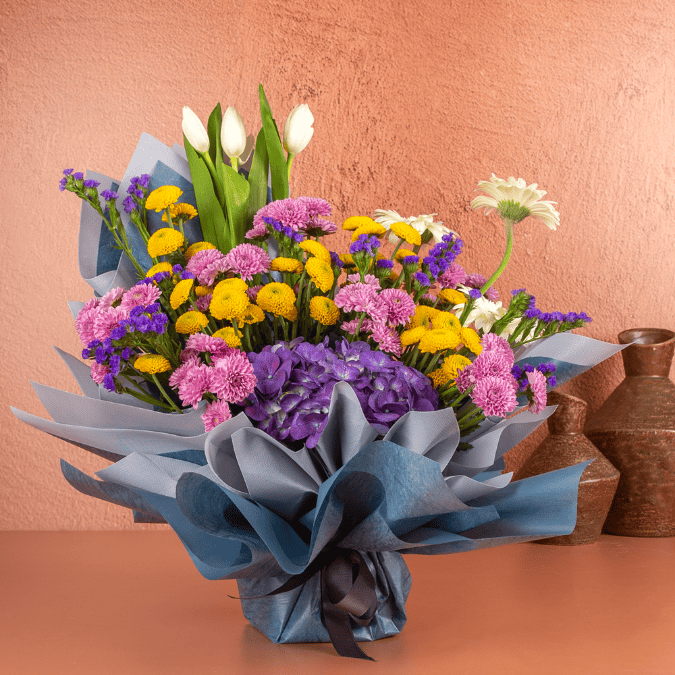 A vivid and creative fresh flower bouquet beautifully decorated and presented