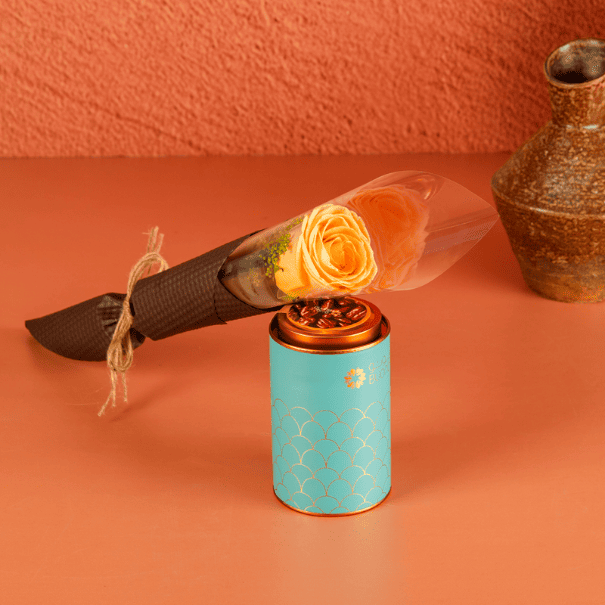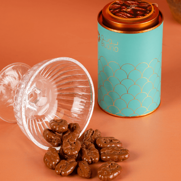 A perfect gift for that special someone! Our 300g caddy box filled with our famous chocolate pecan presented with a single rose design