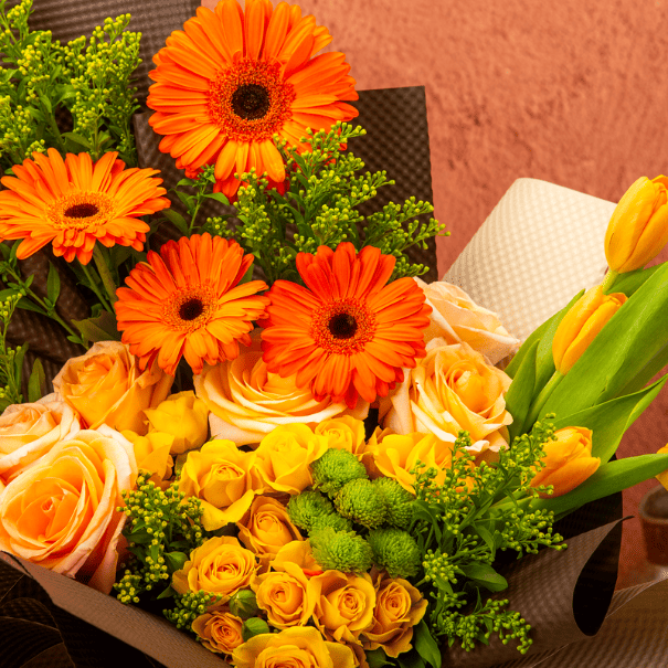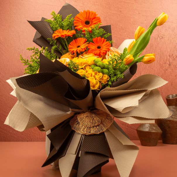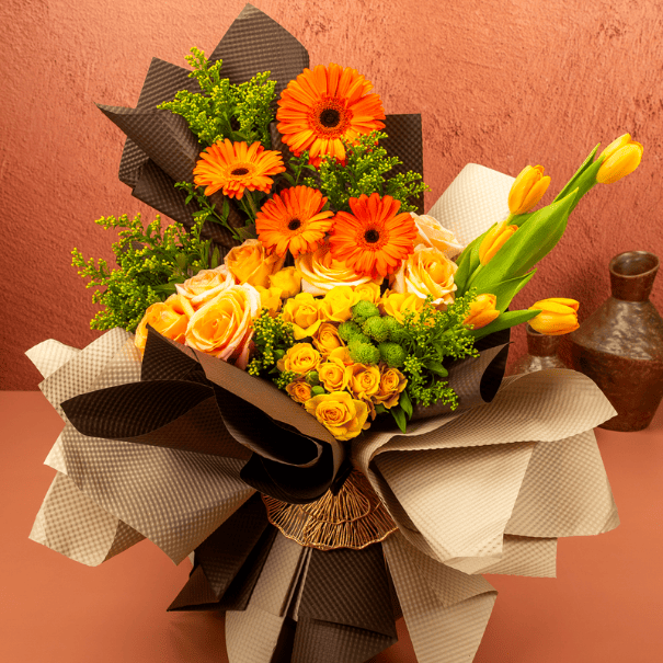 A truly artistic fresh flower arrangement beautifully presented in tones of orange and yellow