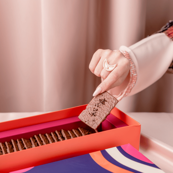 A 210 g box containing our delicate crunchy coffee biscuit enrobed in the finest milk chocolate and topped with a coffee crumble.