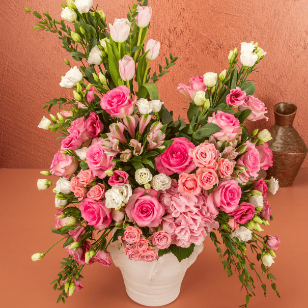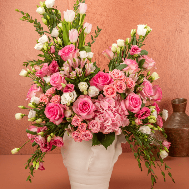 A vivid and impactful fresh flower arrangement set in a stunning white ceramic vase