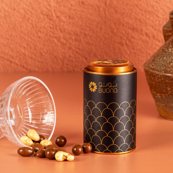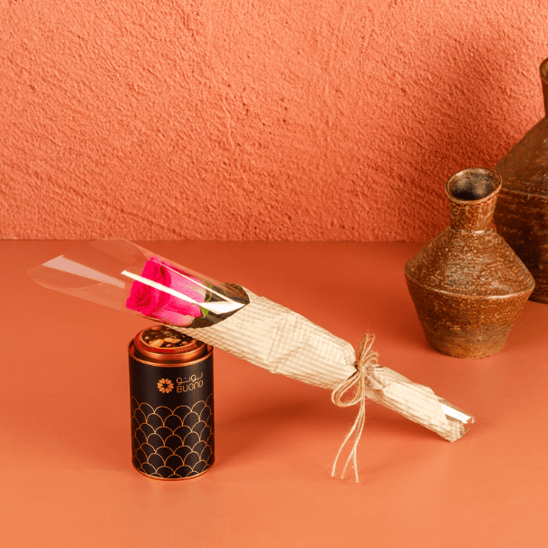 A perfect gift for that special someone! Our 300g caddy box filled with our delicious chocolate mixed nuts presented with a single rose design