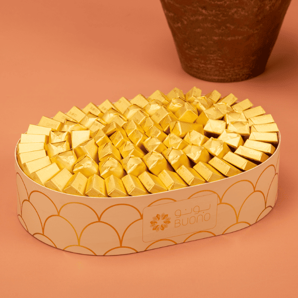 Our elegant oval branded gift tray filled with 1 kg of our finest wrapped chocolate assortment