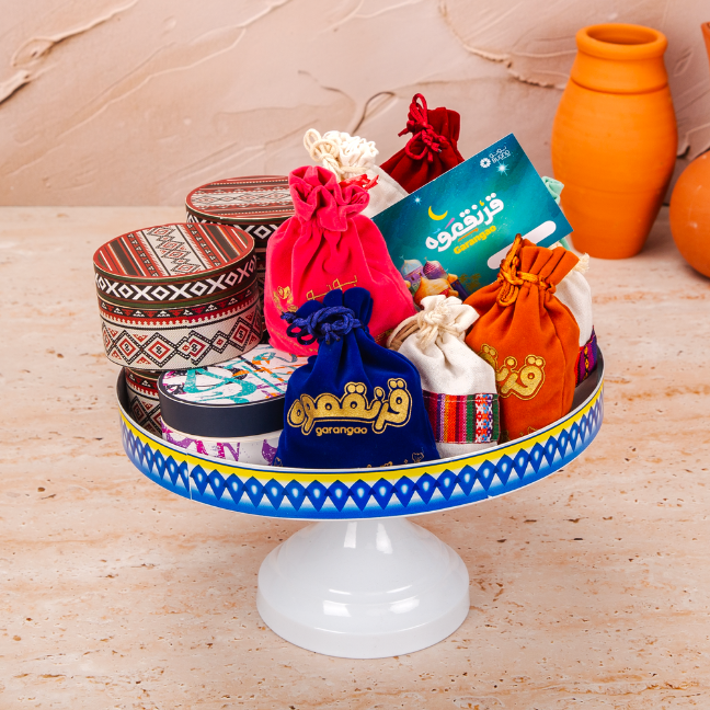 A cake-style layered presentation tray filled with colourful pouches and curva boxes ! filled with nuts and candies— designed as a centrepiece Garangoa treat tower.