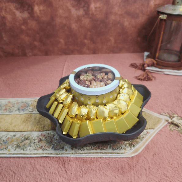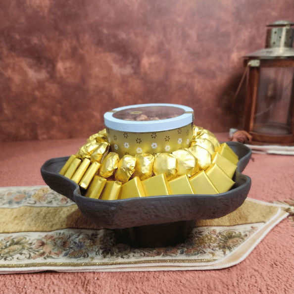 This sophisticated arrangement features 1.56 kg of premium chocolates, elegantly wrapped in brilliant gold foil. Crowned with a signature tin of Buono mixed pecans and presented on a unique, charcoal-toned textured ceramic plate with a stylish wavy rim, the collection is a modern and tasteful centerpiece for your holiday hospitality.