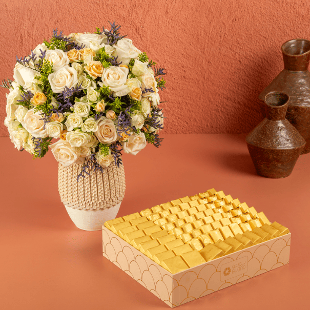 Buono is the home of the best combo bundles! Our branded gift tray with 1.3 kg of our finest wrapped chocolate assortment presented with a stunning fresh flower vase arrangement