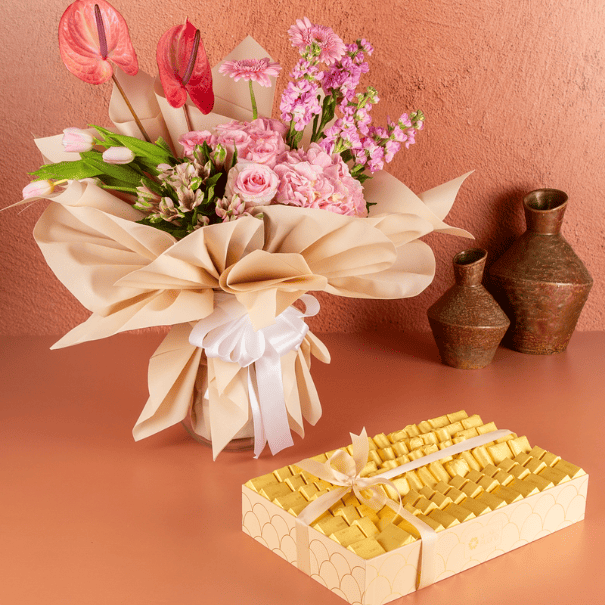 Buono is the home of the best combo bundles! Our branded gift tray with 2 kg of our finest wrapped chocolates assortment presented with a stunningly beautiful fresh flower bouquet