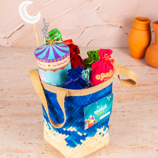 A woven fade basket filled with colorful pouches filled with nuts and candies, a garangoa music box and larger sweets for added festive charm.