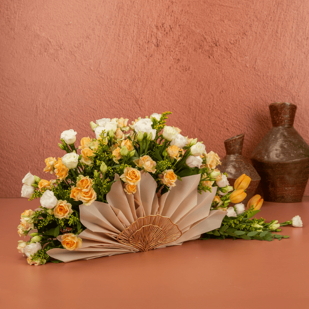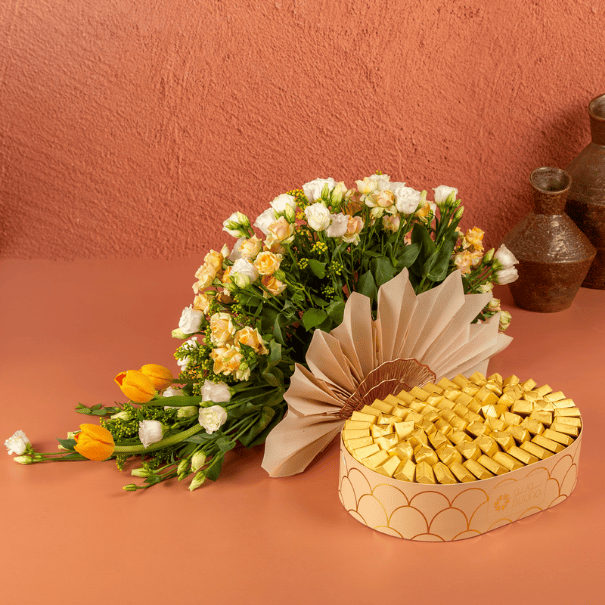 Buono is the home of the best combo bundles! Our branded oval gift tray with 1 kg of our finest wrapped chocolates assortment presented with a unique fan style fresh flower arrangement