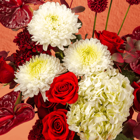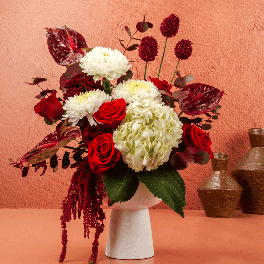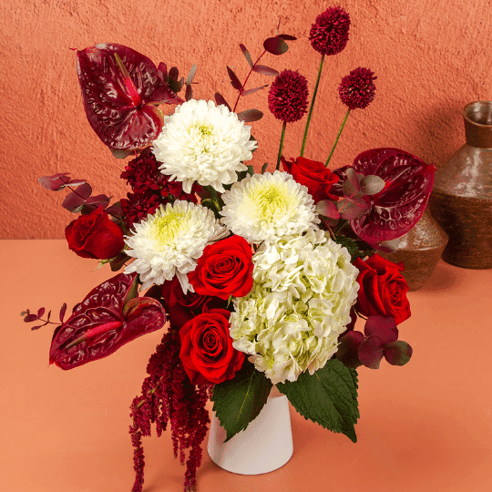 A spectacular themed fresh flower display in a sleek white ceramic vase