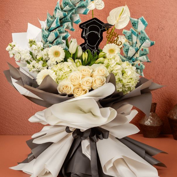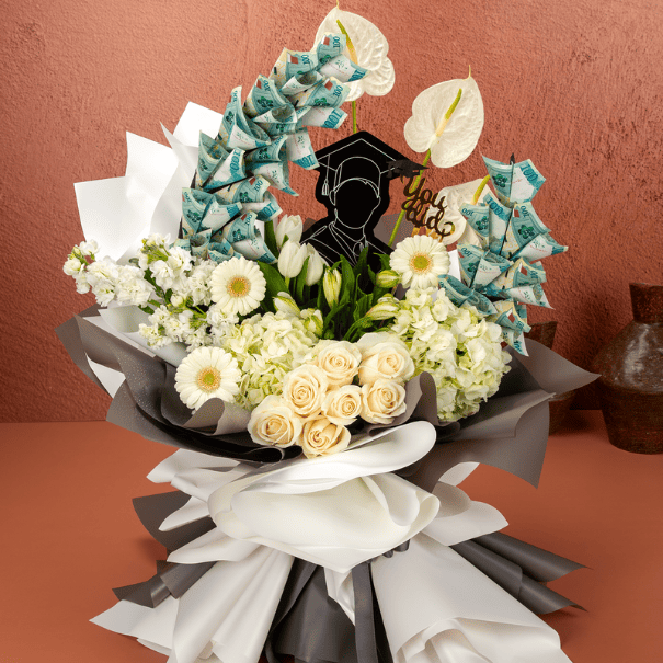 When its time to celebrate a graduate, then let’s do it with style! A stunning fresh flower bouquet with themed decoration