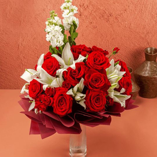 A beautifully presented fresh flower vase, perfectly matched with a bouquet-shaped vase
