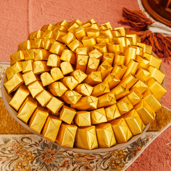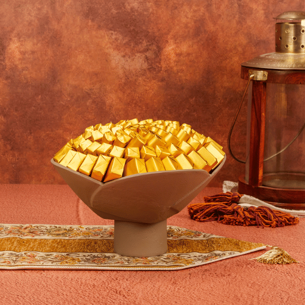 This elegant Eid chocolate arrangement features 1.75 kg of premium chocolates, individually wrapped in brilliant gold foil. Beautifully presented on a classic earthy ceramic plate, the Waha collection is a warm and inviting gift for your festive holiday family gatherings.